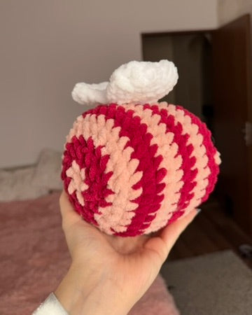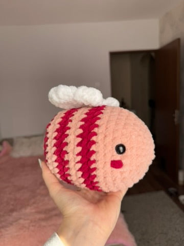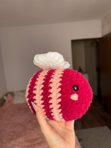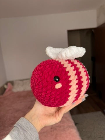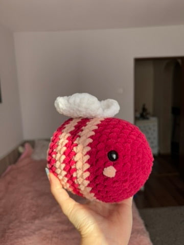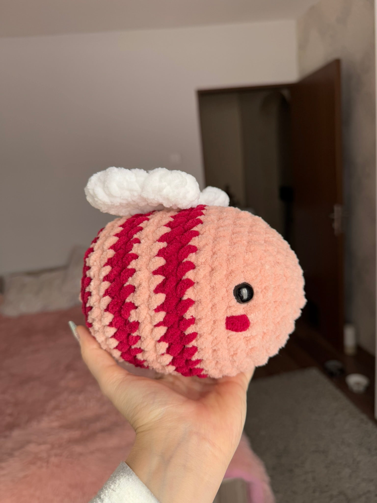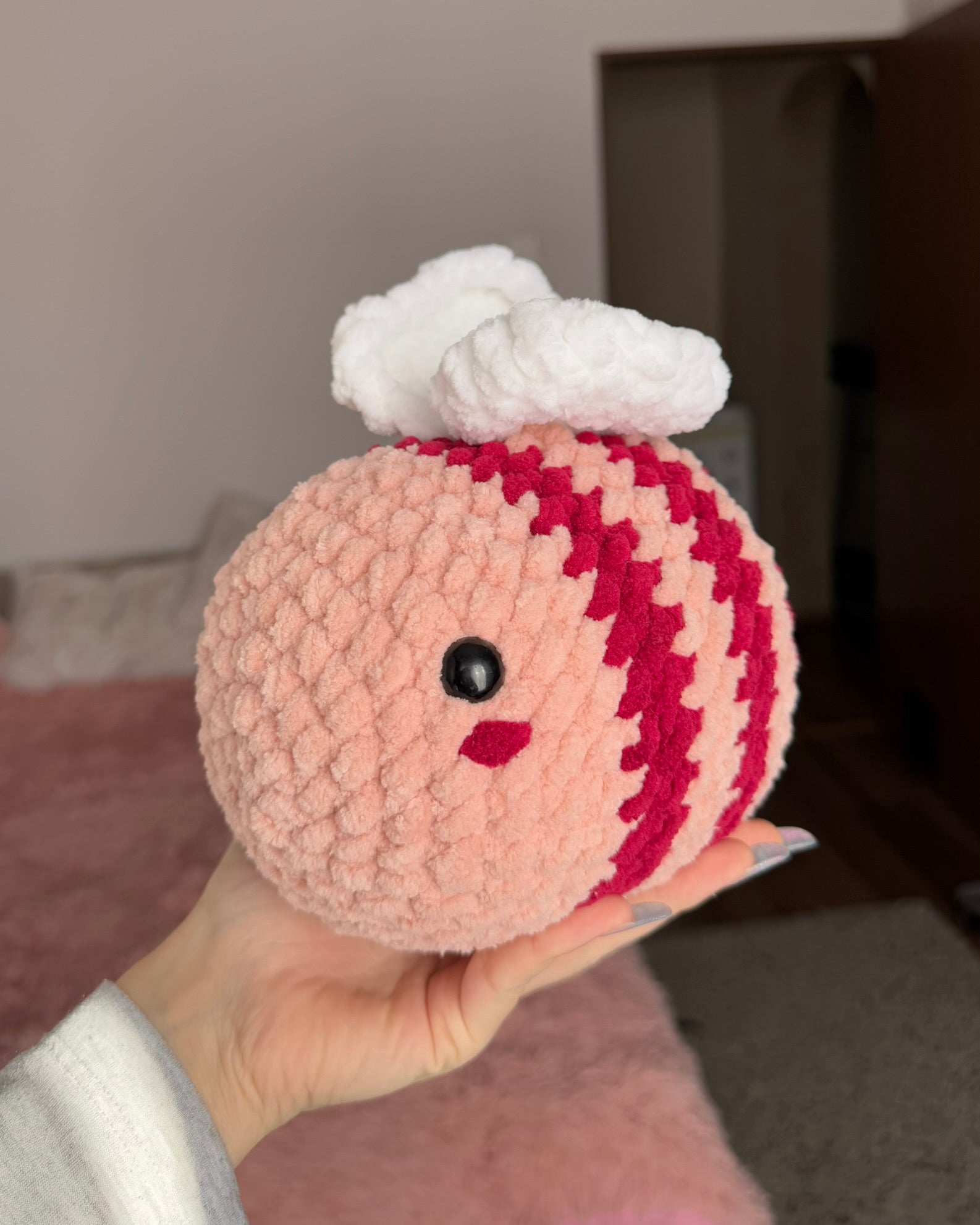 Această albinuță croșetată este rotunjoară și extrem de simpatică, perfectă pentru a aduce un strop de veselie în orice colț al casei. Dungile colorate și aripioarele pufoase îi oferă un aspect jucăuș, iar expresia prietenoasă o transformă într-un mic companion adorabil. 🐝