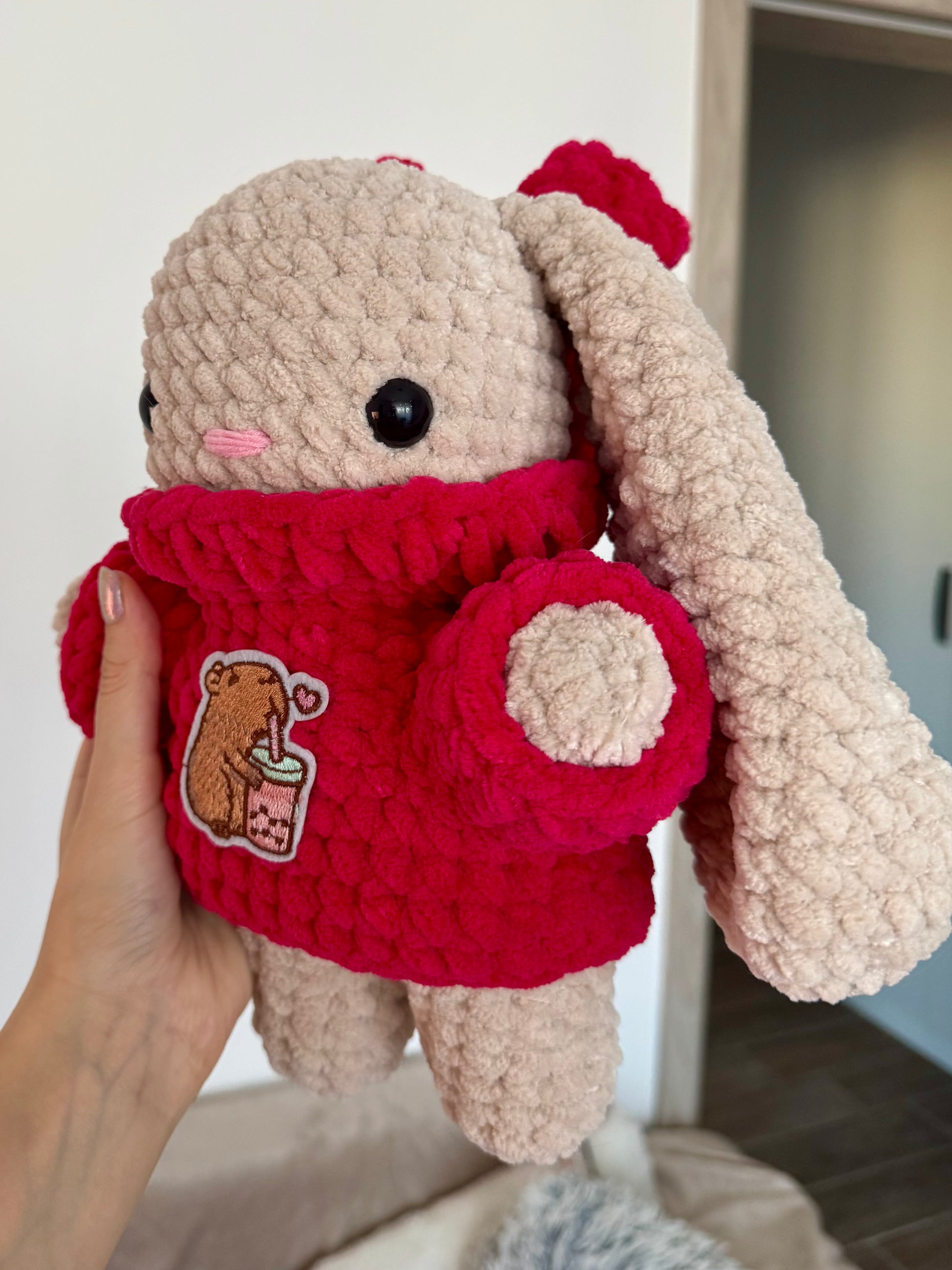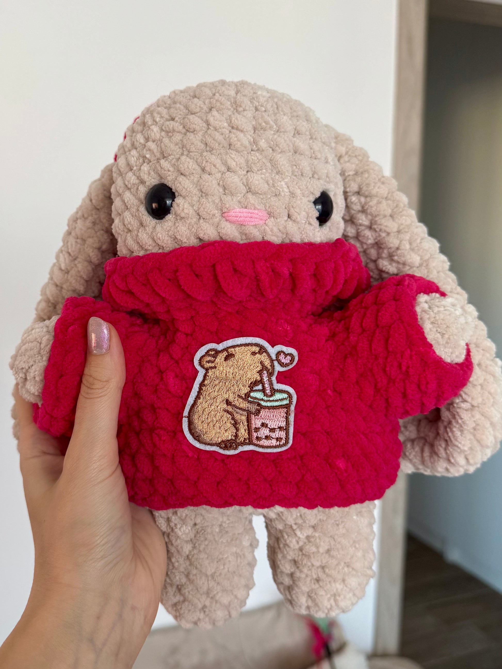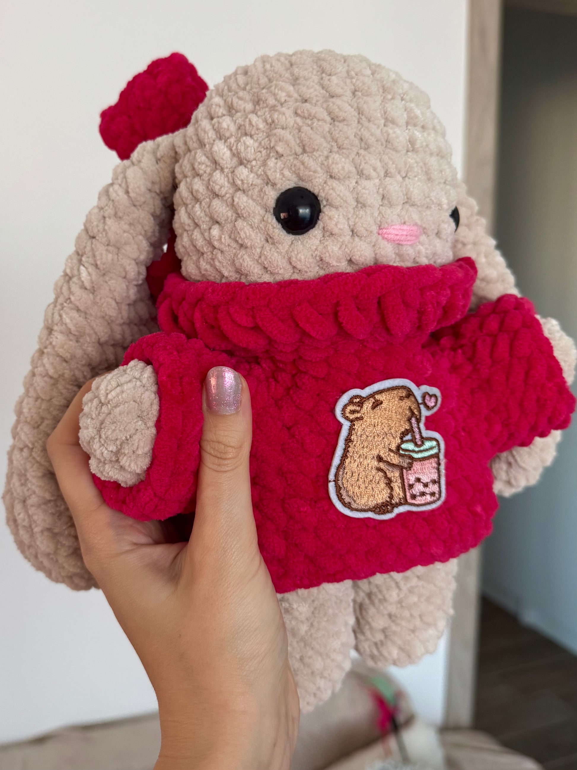 O bombonică colorată! 🍬 Iepuraș croșetat bej, cu pulover pe gât într-o nuanță de roz fucsia pe care este atașat un patch cu capybara care bea bubble tea. ✨