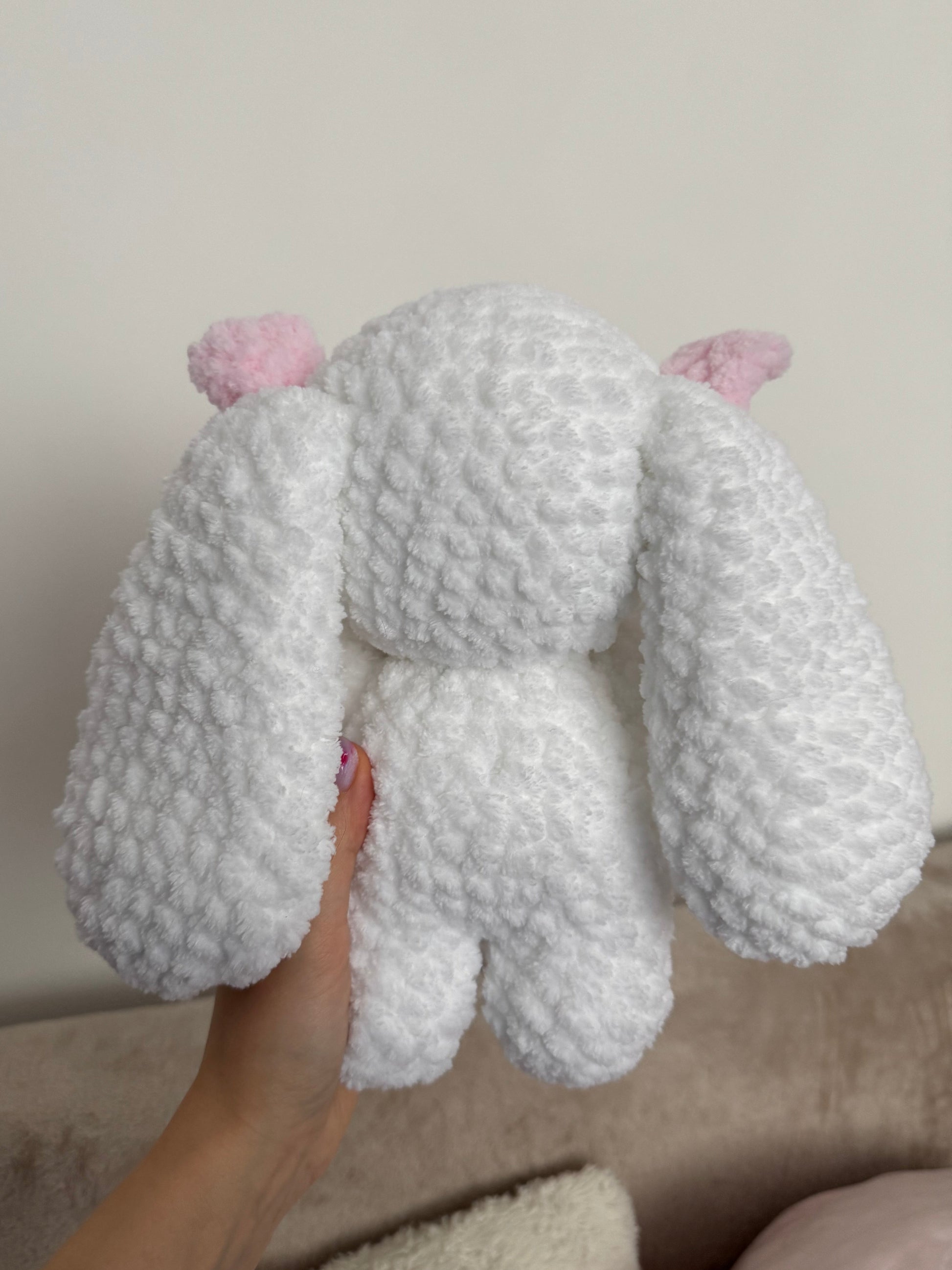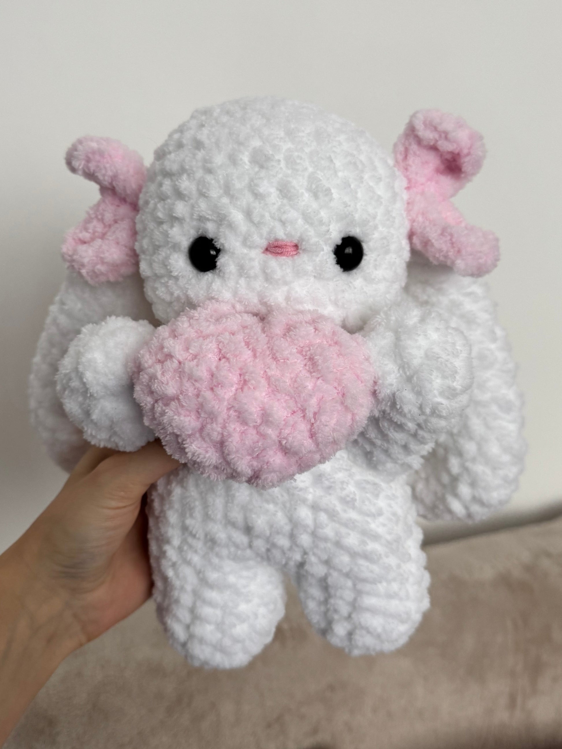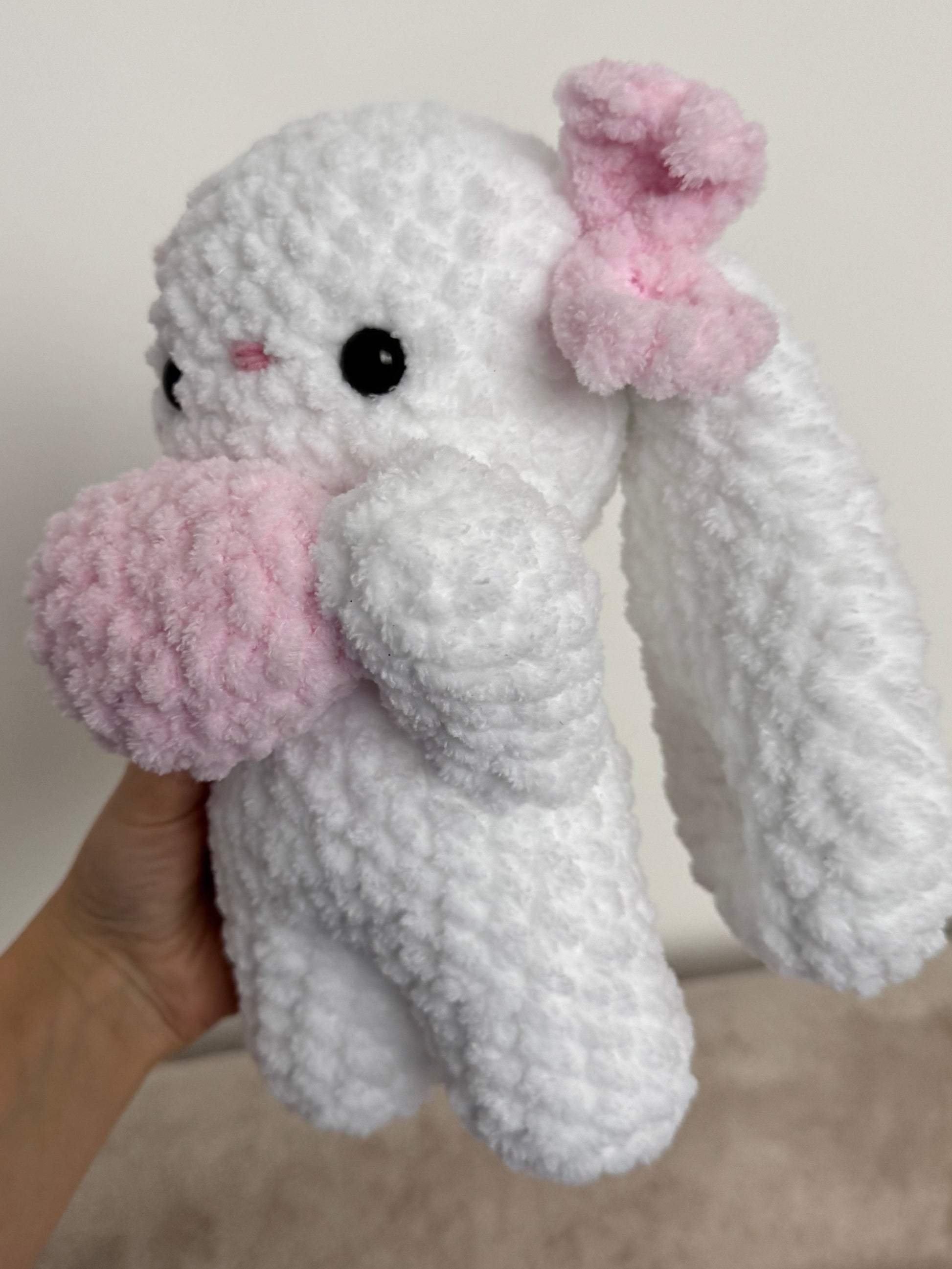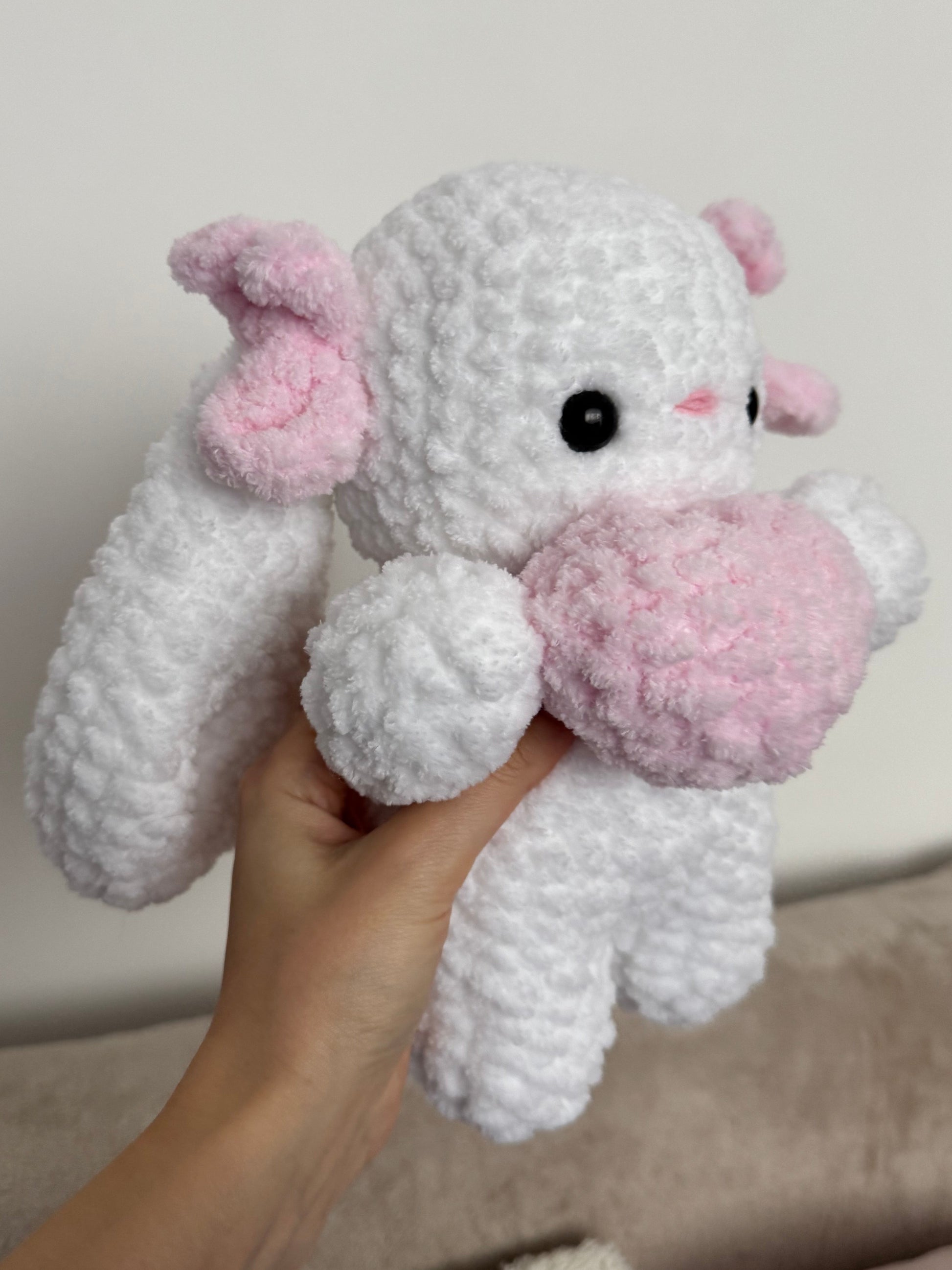 Un iepuraș croșetat pufos care pare că îți oferă o inimioară direct din lumea lui. Mic, drăgălaș și plin de tandrețe, acest companion croșetat este perfect pentru a transmite un gest de afecțiune sau pentru a aduce un strop de cute în orice colț al casei. 💕