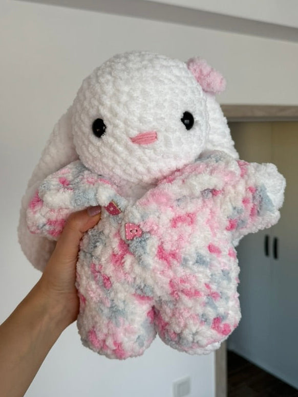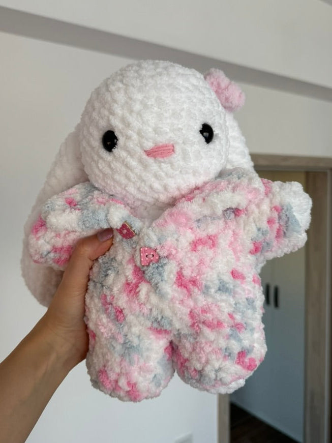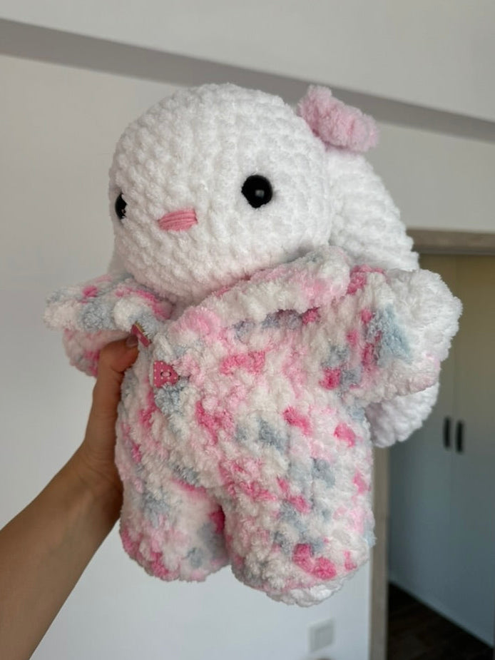 Un iepuraș croșetat pufos cu urechiușe lungi și o salopetă moale în nuanțe pastelate de roz și alb. Textura pufoasă și combinația de culori îi oferă un aer jucăuș și foarte drăgălaș. Perfect pentru iubitorii de jucării handmade, pentru decor sau pentru a fi oferit cadou cuiva drag. ✨